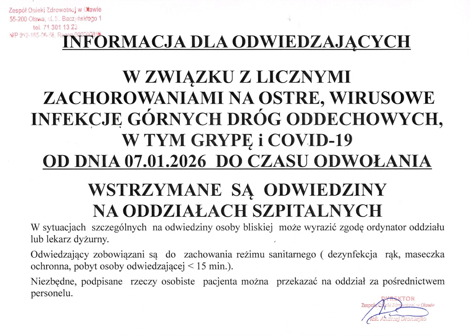 Szanowni Państwo, w trosce o dobro naszych pacjentów, podjęliśmy decyzję o wstrzymaniu odwiedzin na wszystkich oddziałach szpitalnych.Przepraszamy za utrudnienia i jednocześnie liczymy na Pańs...